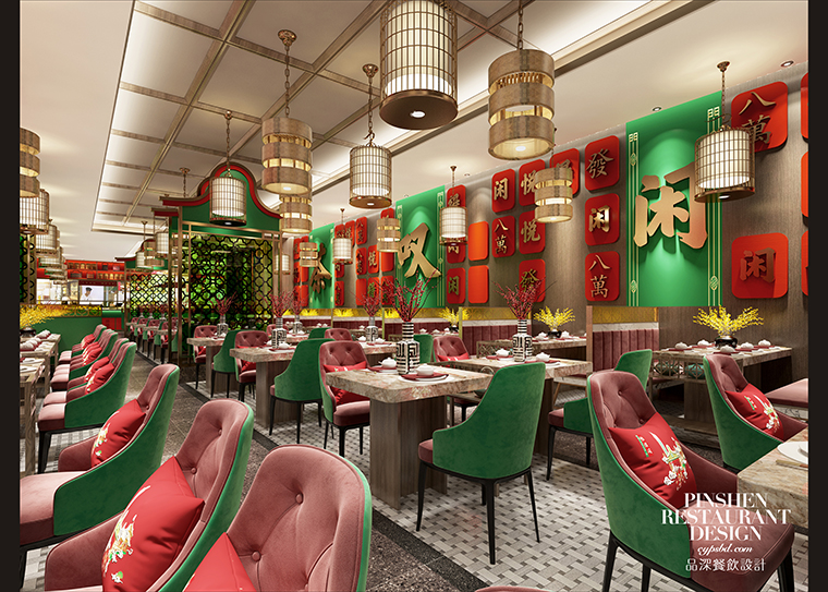 7、燈光設計:燈光對餐飲空間環境塑造起著非常重要的作用,通過燈光設計塑造出不同的氣氛。我們茶樓屬于比較熱鬧的用餐氛圍,整個空間除了餐廳的整體基礎照明外,我們對局部照明使用了具有濃郁廣式點心茶樓特性的鳥籠燈,蒸籠燈,讓照明燈具也成為了空間美學的重要部分,讓顧客印象深刻。