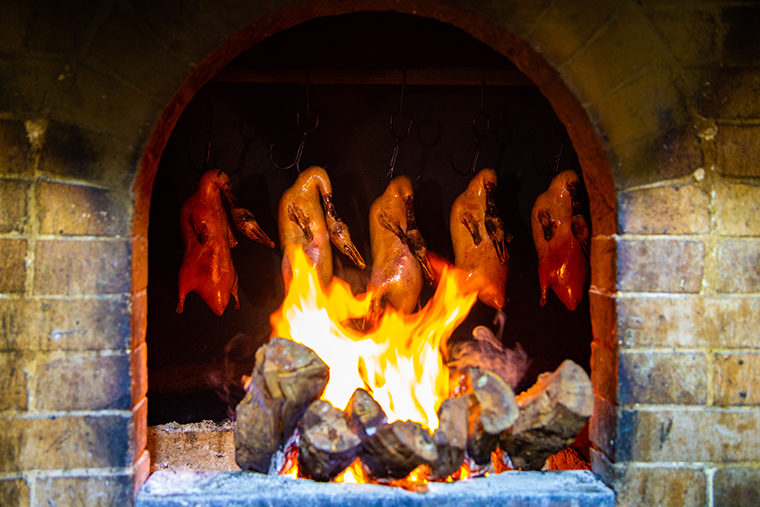 于是,我們推導出這么一條邏輯線:地道的北京烤鴨技法源自宮廷御廚,御廚烤好的鴨子呈現油光明亮的暗紅色,就如同北京故宮的宮墻紅,鮮明奪目。