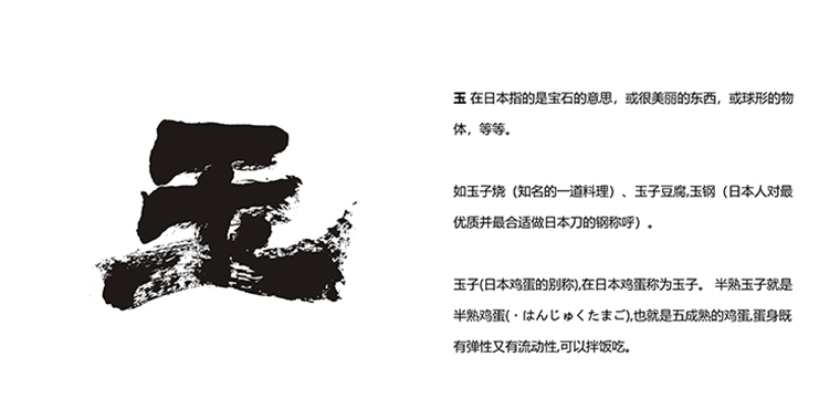 “玉”在日本指的是寶石的意思,或很美麗的東西,或球形的物體等等。如玉子(日本雞蛋的別稱),半熟玉子就是半熟雞蛋(はんじゅくたまご),也就是五成熟的雞蛋,蛋身既有彈性又有流動性,可以拌飯吃。玉子燒(知名的一道料理),玉子豆腐,玉鋼(日本人對最優質并最合適做日本刀的鋼的美稱)。