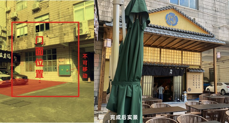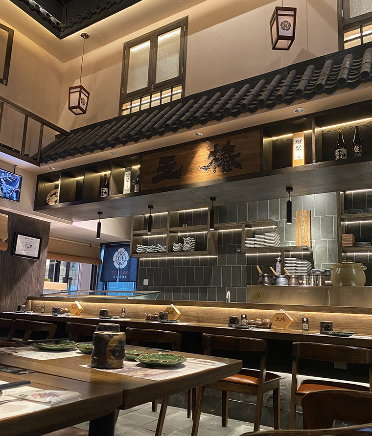 千年古都”。我們發現京都是日本古建筑保留最完整,古跡留存最多的城市,名勝古跡,數不勝數。玉椿要傳達京都味道,地域文化就是美食地道的證明。我們從門頭開始到天花吊頂、地面鋪設、墻面涂料、燈光、家具等各方面圍繞“