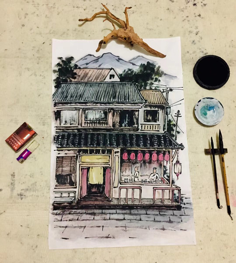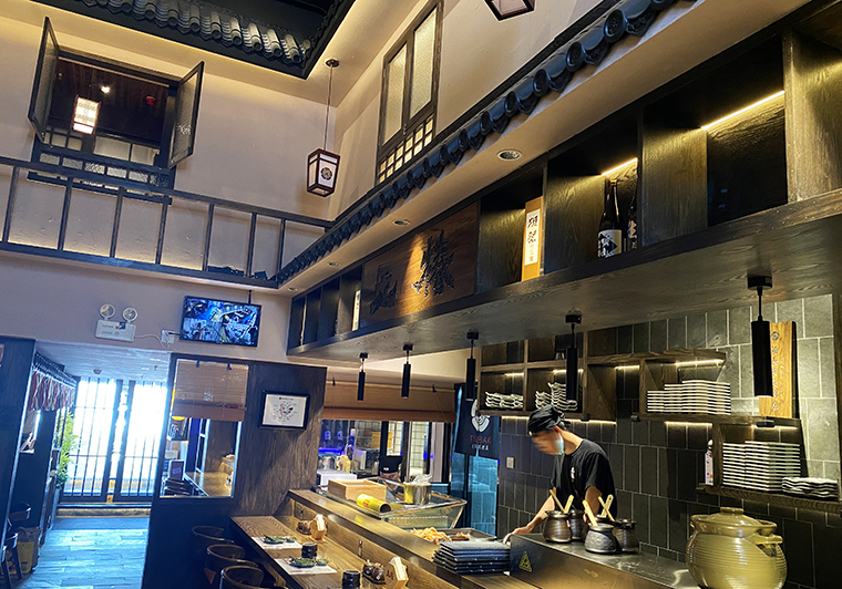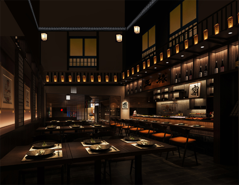 2、一樓大廳及吊頂的設計:把京都的古老街道,巷子搬到我們店里。整個大廳的頂部環繞一圈日式黑瓦頂,四周幾個日式玻璃木窗,與地面的青石瓦面,墻體的稻草漆,燒烤吧臺形成一體化的京都風格。置身其中,仿佛