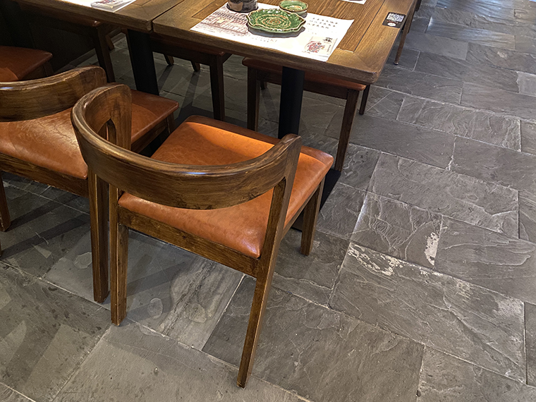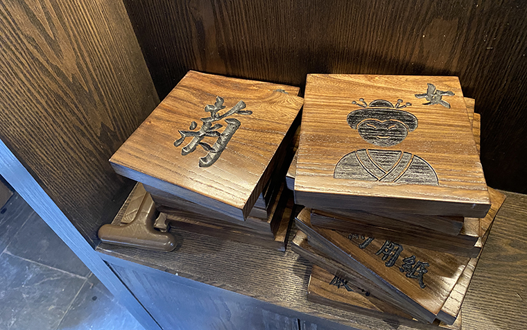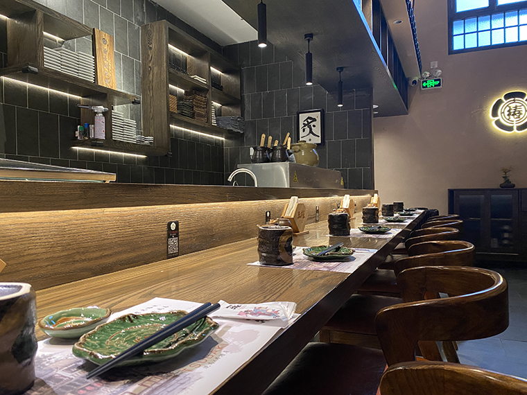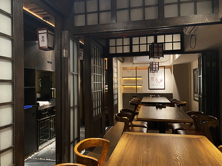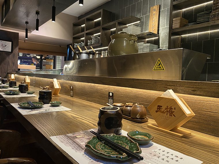 為了營造京都風格的空間感受,品深餐飲為玉椿設計定制的家具采用了實木材質,開放漆做舊工藝處理,呈現出一種江戶時代的歷史滄桑質感;與門店的招牌匾額,儲存柜顏色完全一致,顧客使用時候的歷史
