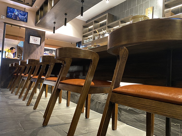 感受燒鳥店煙火氣的是燒烤臺前的長吧臺。當我們坐在燒鳥長吧臺前,看著燒鳥師傅熟練地穿串,精準地控制火候,不時地翻動烤串,美味現場呈現,匠傳玉椿的理念就鮮明直觀地傳達出來了。所以,整個大廳都是圍繞著燒烤吧臺這一焦點而展開的,全部為單人椅及兩人座位,位置靈活組合,利用率非常高。