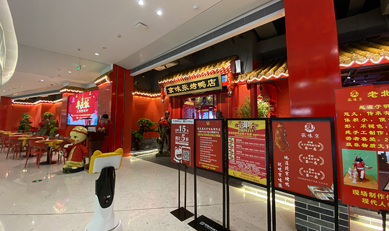 品深設計全案升級的京味張烤鴨店,是北京菜的代表品牌,整個門面采用大面積中國紅,非常鮮明,醒目。消費者可以用一句話就表達出來:整個門面全部是紅色那個餐廳。這就很好被消費者傳播了。色彩色調搭配在門面設計、門頭設計中需要重點考慮,合理搭配。