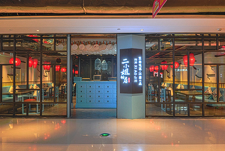 餐廳品牌形象設(shè)計,在策劃階段需明確定位,LOGO形象設(shè)計清楚表達(dá)主題,店面視覺形象上吸睛,有沖擊力。如:二小姐的店,餐廳門前是一組改良設(shè)計后的藍(lán)綠色多寶格咨詢臺,多寶格根據(jù)中式家具的中藥箱款式優(yōu)化設(shè)計而來。