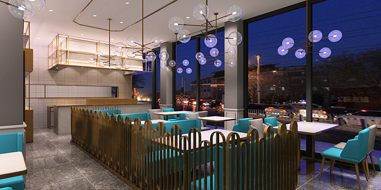 港灣茶餐廳內(nèi)部裝飾盡量簡潔為主,沒有繁復(fù)的線條,整裝護墻板采用高級灰,時尚感強,藍(lán)綠色的招牌外觀,純鐵藝格柵,金色鍍銅架,整體氛圍休閑時尚,富有網(wǎng)紅特質(zhì)。