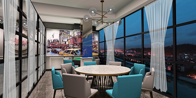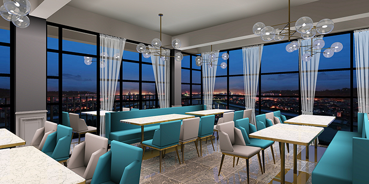 港灣茶餐廳空間裝飾裝修設(shè)計圍繞“時尚、休閑、放松”為設(shè)計哲學(xué),將原來餐廳建筑物的外墻全部打掉,形成大面積落地幕墻玻璃,視覺通透,明亮純凈,周邊路過的顧客紛紛駐足停留,拍照打卡。