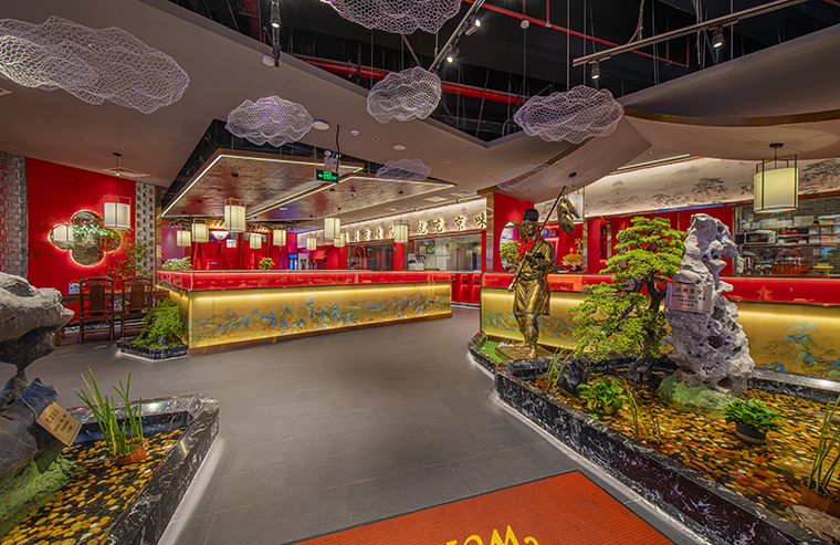 門口的迎賓人,提籠遛鳥人,跑堂人等雕塑銅人將老北京烤鴨飲食文化自然帶出;空間大量借鑒中式園林造景手法,點(diǎn)綴綠植,水景,框景,步移景異;